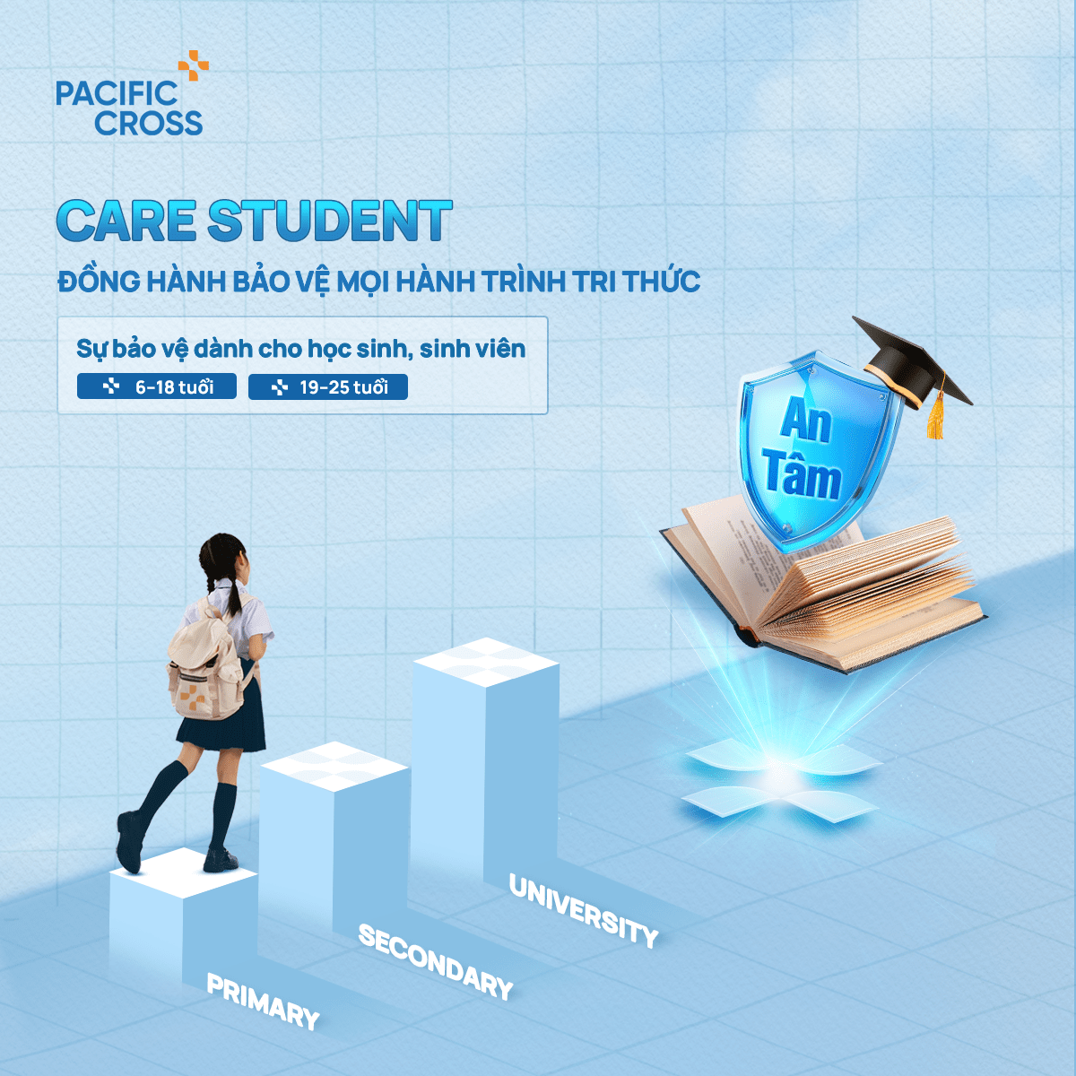 Pacific Cross Việt Nam luôn mong muốn được đồng hành cùng khách hàng “Dẫn lối an tâm, chạm cuộc sống xứng tầm”. Với Care Student, chúng tôi kỳ vọng trở thành điểm tựa vững chắc “Đồng hành bảo vệ mọi hành trình tri thức” của thế hệ trẻ, giúp các em vững tâm học tập và phát triển trong suốt hành trình trưởng thành.